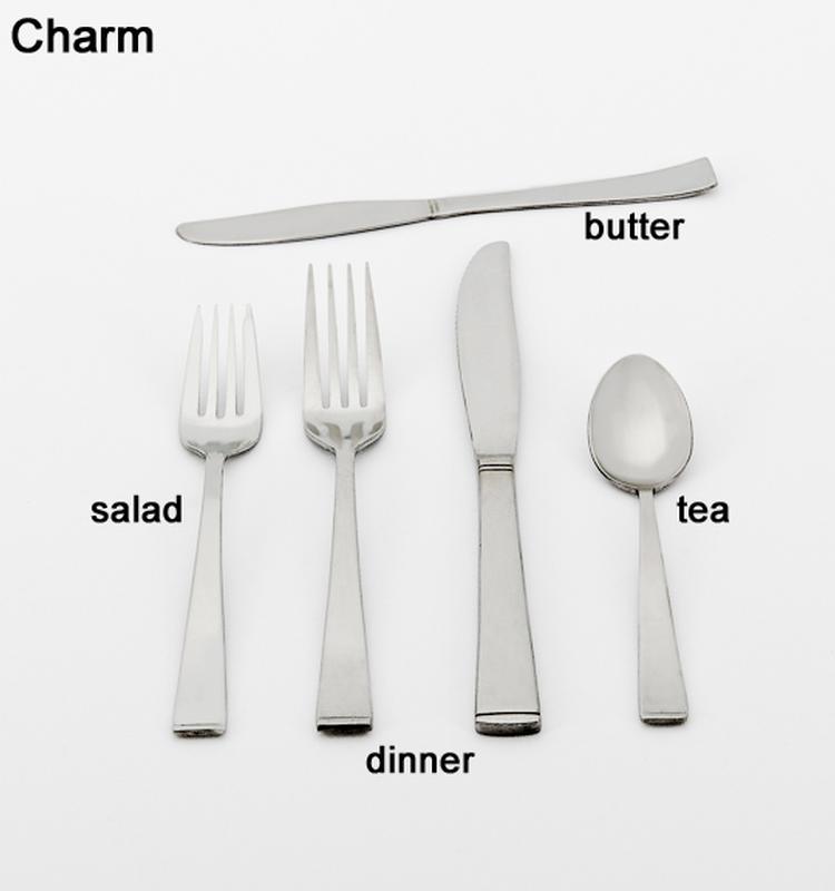 Charm stainless steel flatware provides a modern stainless steel pattern for your rental flatware that makes an ideal choice for your wedding reception, banquet or special event table setting.