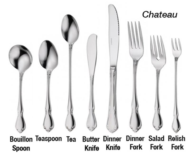 Chateau stainless steel flatware provides a classical stainless steel pattern for your rental flatware that makes an ideal choice for your wedding reception, banquet or special event place setting.
