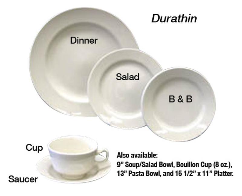 Also available in the Durathin pattern – 9" Soup/Salad Bowl, Bouillon Cup (8 oz.), 13" Pasta Bowl, and 15 1/2" x 11" Platter.