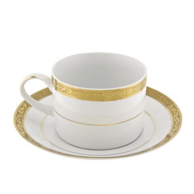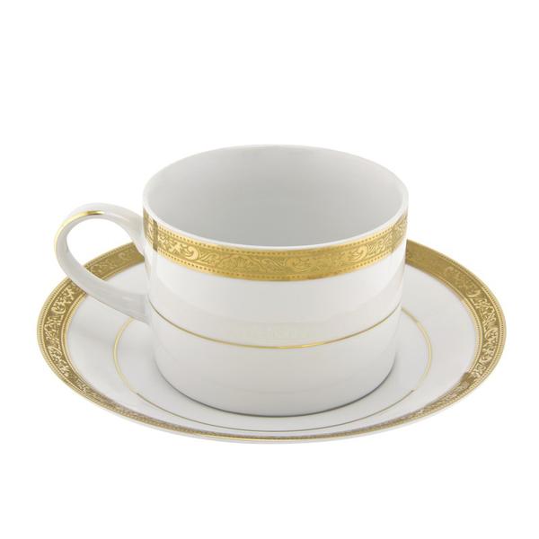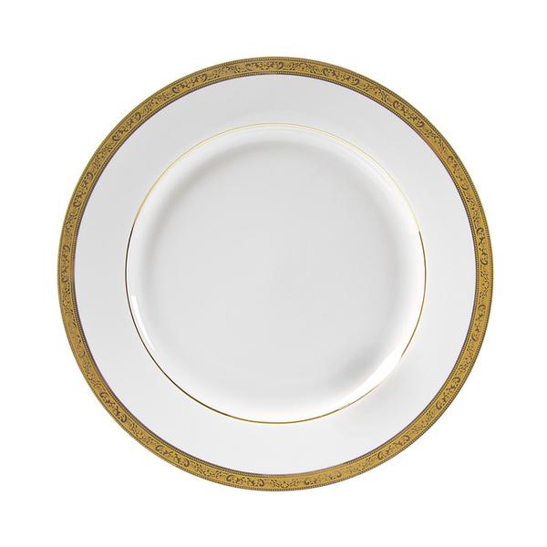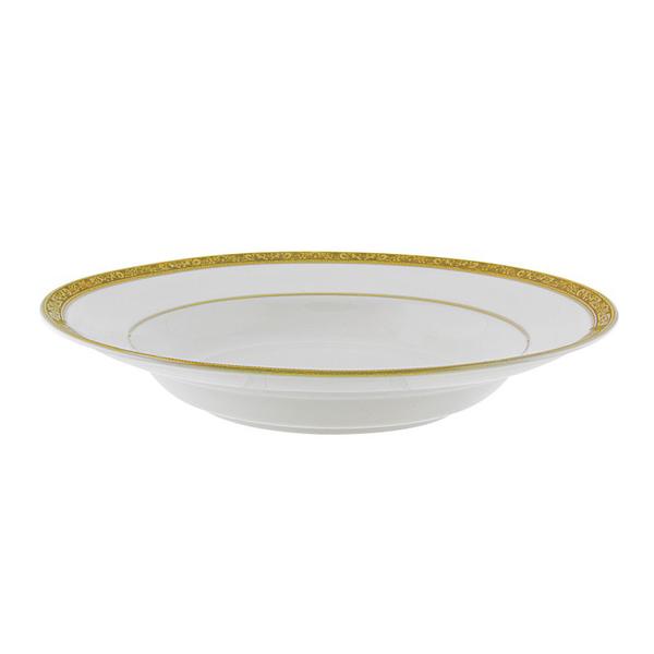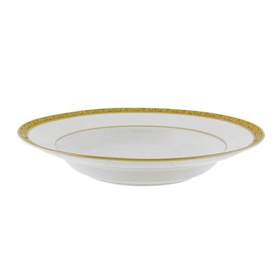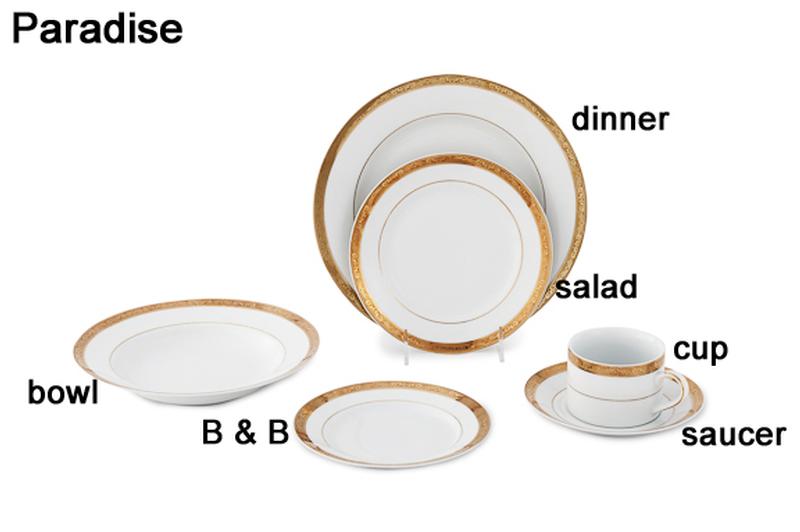 The Paradise china pattern is a white china pattern with a gold band that makes a solid choice of rental table china place setting for your wedding reception or banquet.