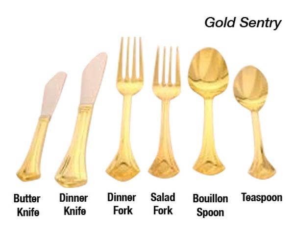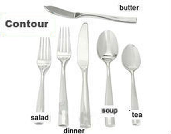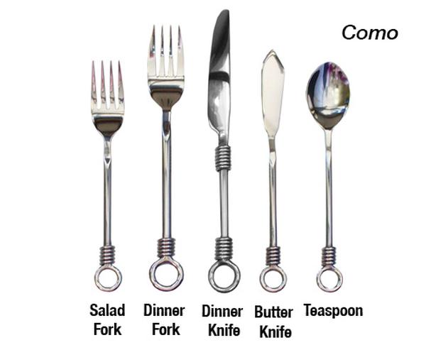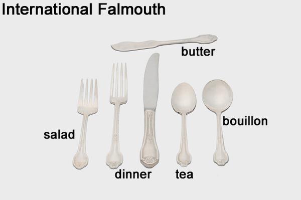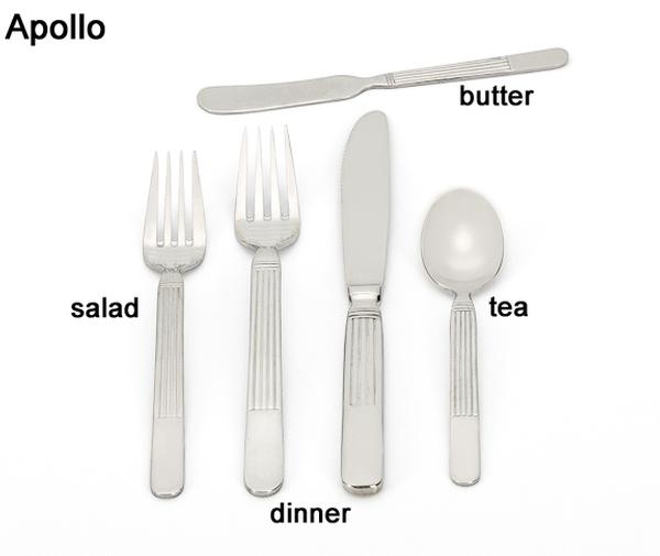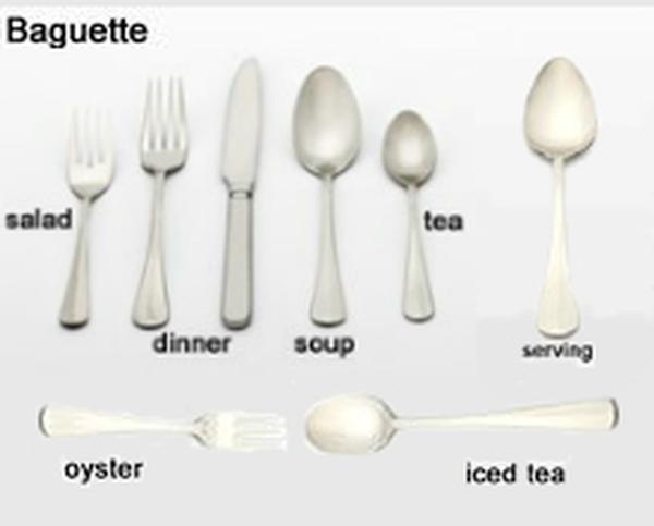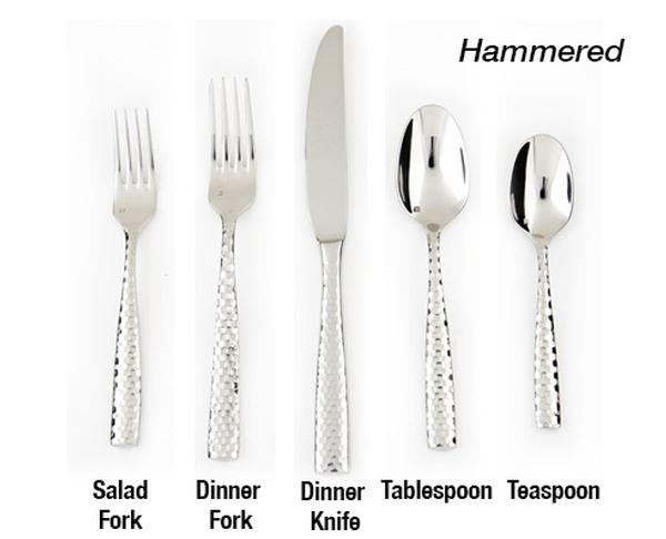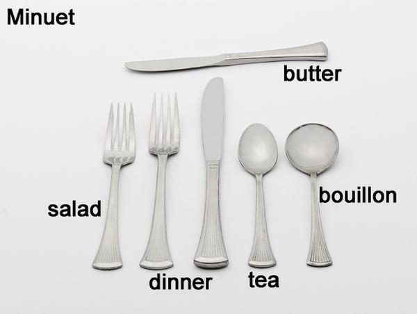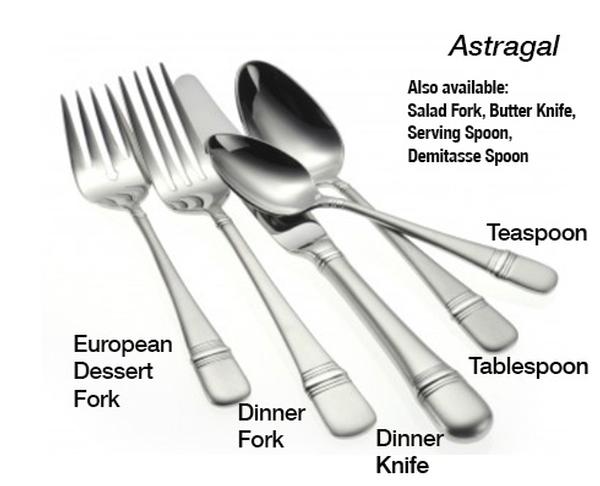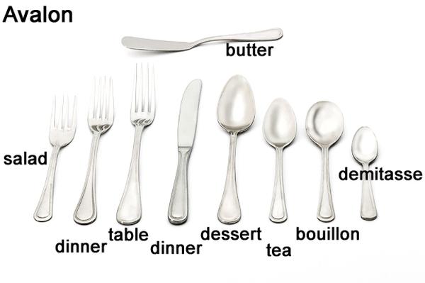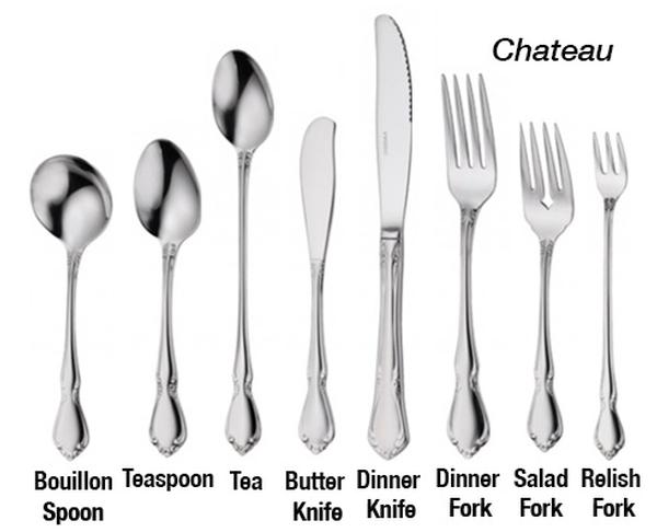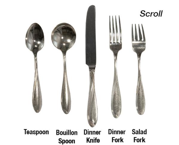 Our flatware includes forks for dinner, table and salad, knives for dinner or butter and spoons for dessert, bouillon or soup, tea and demitasse. We also offer wood or black handled steak knives.
